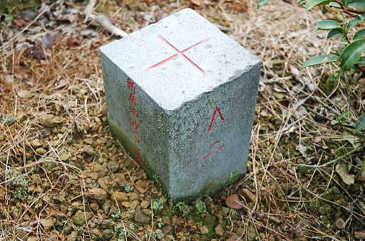 茶園,發現一根長滿青苔的水泥柱。沿著茶園稜線往前走,後來又發現另一根同樣的水泥柱,原來是新店地政事務所的水庫用地界樁,附近山區特別多,密度頗高。 |