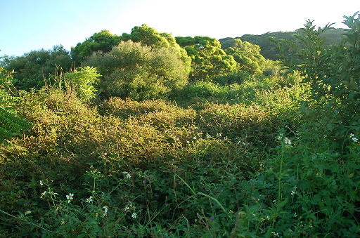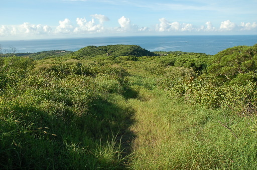 草地叉路,缺乏路條導引,探了一下似乎往右繞上較有可能,果然入樹林後發現登山路條。不久出樹林,又到了雜草叢生的草地區,仔細找尋稀疏的路條,慢慢前進。偶爾回頭,可眺望巴士海峽。H144m |