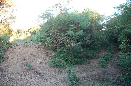 土路叉路,缺乏路條導引,探了一下才發現應取右,後續的路徑雜草漸多。H136m |