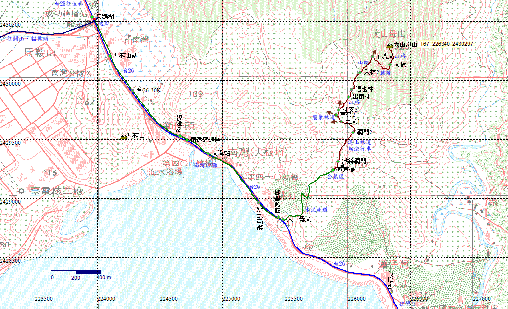 南灣渡假飯店,續前行約30公尺就是大山母山叉路口。H26m |