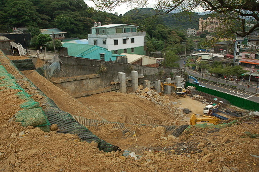 竹園叉路,取右循大土路緩下。不久出現少許墓園。最後經過幾個月前發生家具行擋土牆大崩塌事件的地方,正在重建中。繞著崩塌區外圍,接民宅車道續往下。H119m |