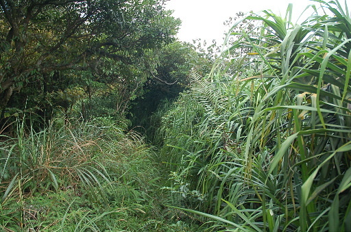 定國山稜線叉路,明顯好走的農路右轉循稜往竹園,定國山的入口芒草茂密,取左進入,隨即再遇叉路,左循稜線保線路往定國山,直下往新西街,取左。這條保線路久未除草,芒草、雜草略高,但還不算太難走,入樹林或竹園中則路況轉佳。H112m |