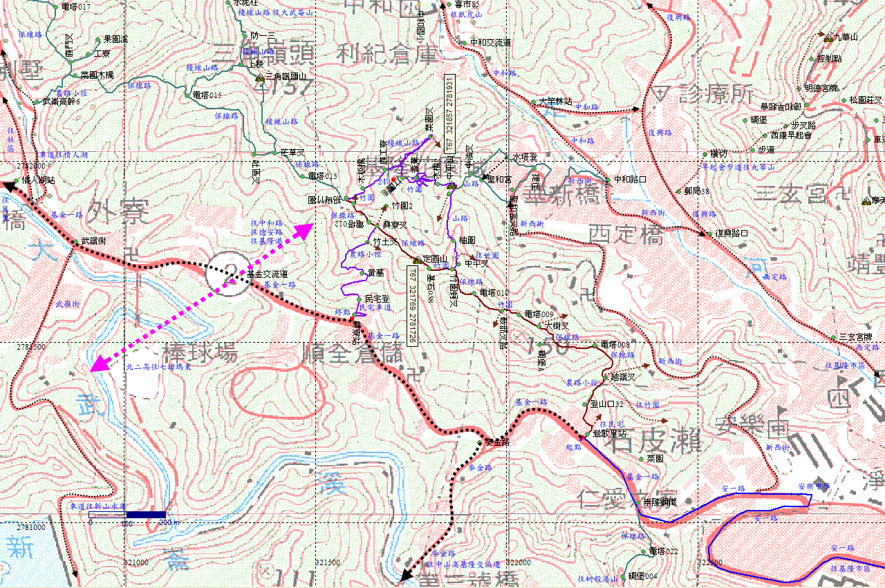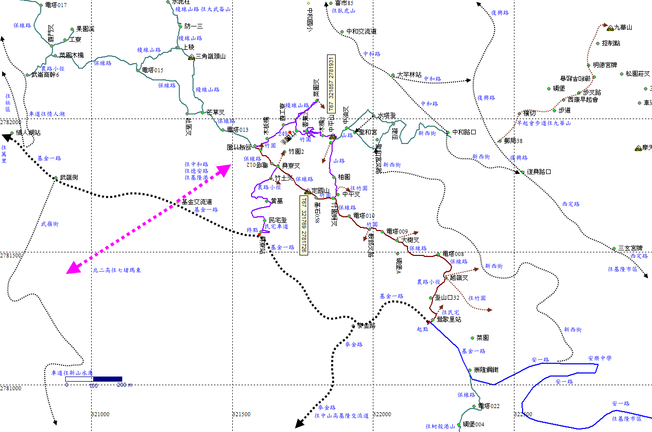 電塔009(安樂-中幅線)。很快就進入經常有人整理的竹園,路況極佳,抓方向循稜而行。這附近展望極佳,可遠眺大武崙山、內木山。H138m |