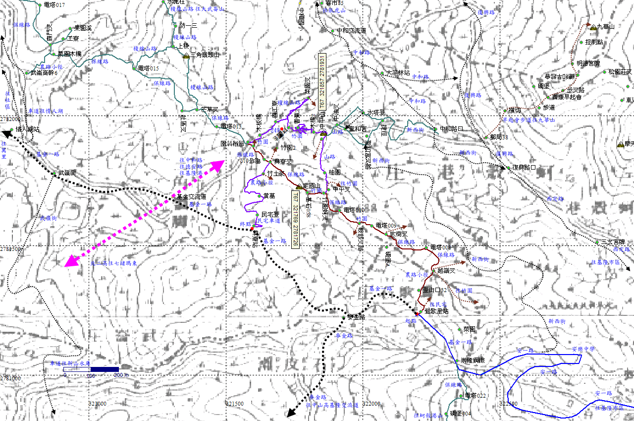 竹園叉路,右下入竹園,有路條,續前行。H108m |