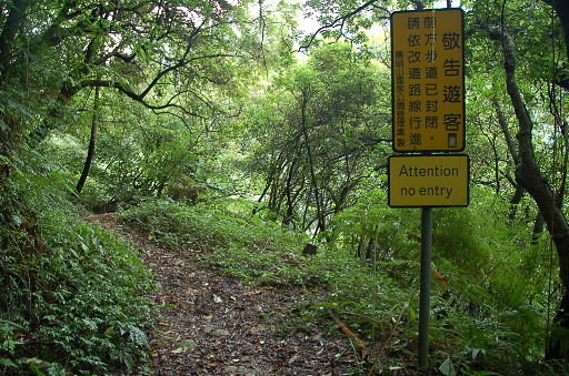 回到日人路,這一端的低繞下切點並不明顯,就在封鎖的塑膠條旁,續行的古道路基仍寬平好走。 |