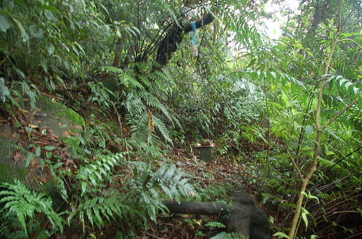 三重橋叉路,位於日人路上樹幹做成的圍欄之前約10公尺,山路陡上不顯眼,往上攀約十幾公尺即到達基石處。H452m |
