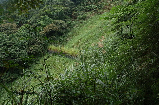 古道坍方,這處大坍方把日人路、河南勇路、水圳道都毀了,上次反向而來找不到通過的方法,因此高繞頂中股山。這處大坍方已發生多年,崩塌區建有輪胎擋石牆,整個區域已長滿了芒草。取左循石頭山路往下約10公尺,再折回腰繞緩上,進入芒草區,芒草區內有段陡降即抵輪胎擋石牆旁,沿著輪胎擋石牆旁邊走,還不算太難走,沒有明顯危險之處,只是幾乎沒有登山路條導引。過了崩塌區之後,急陡上攀樹藤,很快即回到日人路。H391m |
