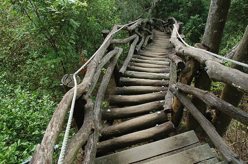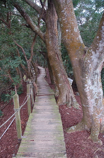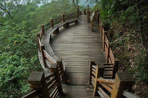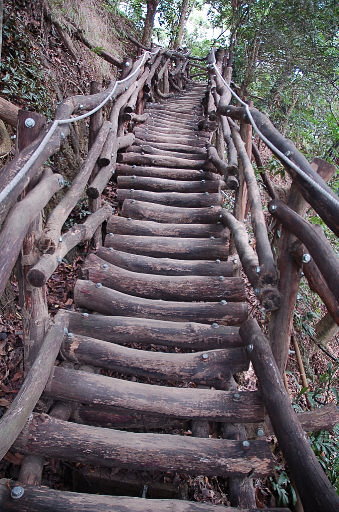 風動石下方叉路,風動石與涼亭之間另有一條步道可到此處,但已封閉,續往下的是樹幹步道,相當別緻,但行走要留意,以防踏空。 |