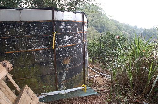 水塔叉路,步道高點木椅休息區,旁邊為柑園水塔,水塔旁的小徑進入柑園可登聚興山。取之。柑園中橘子正成熟,果實累累,瓜田李下不得已,勿起貪念。H491m |