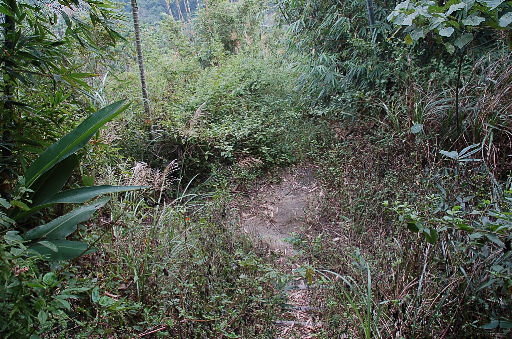 續行,稜線在此分歧,左往湳底巷,右往龍興巷,右路有不少登山路條,左路則無,決定試探左路。走了幾十公尺開始路跡不清,且無路條,放棄。 |