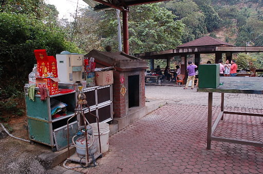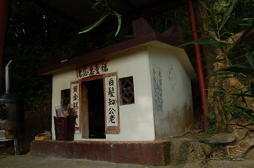 福德祠,磚造小土地公廟,第三段步道出口,廟旁設有涼亭,休息。福德祠的旁邊另有一條步道往上,或許可通第二段步道中途的叉路。H359m |