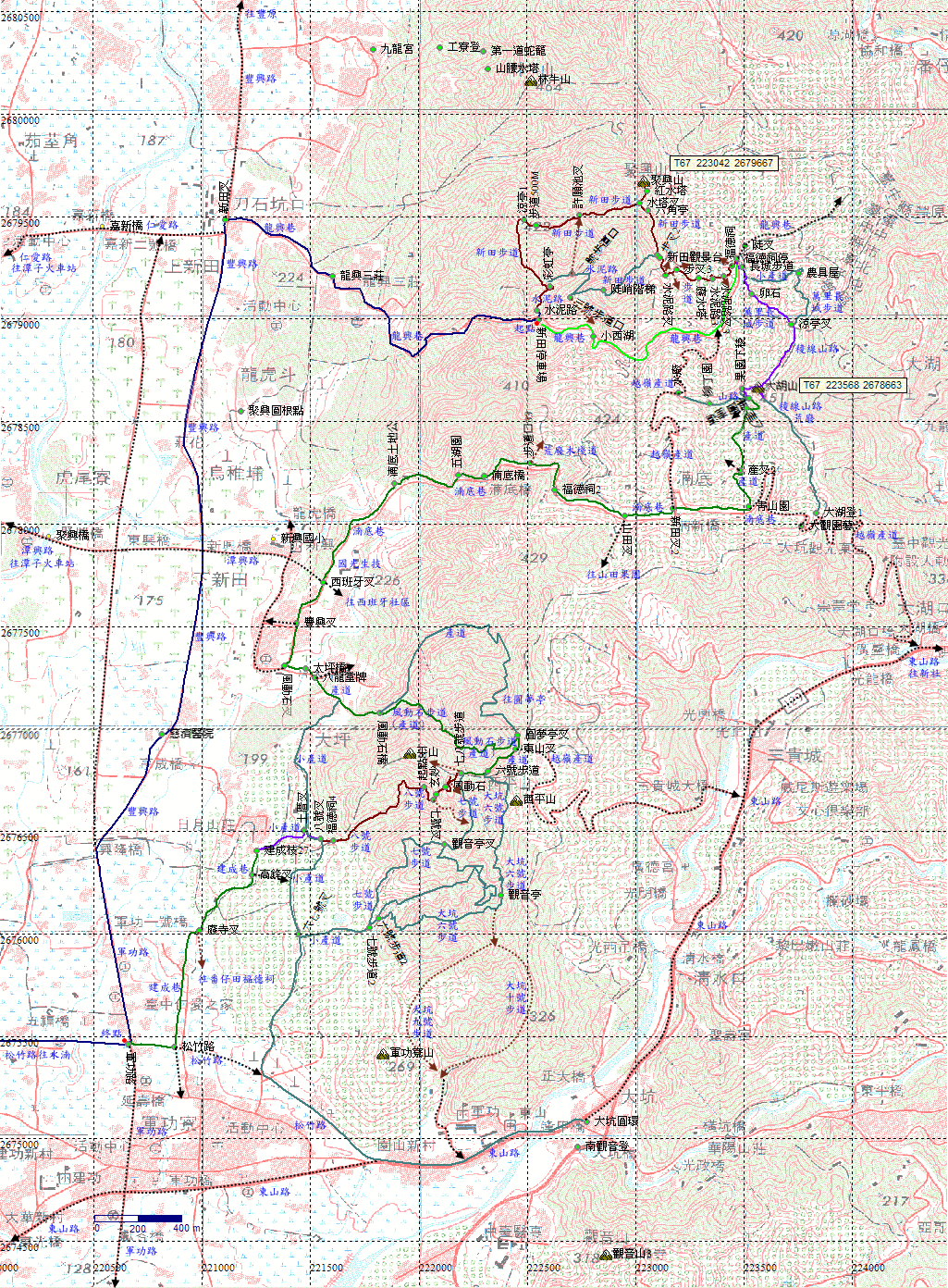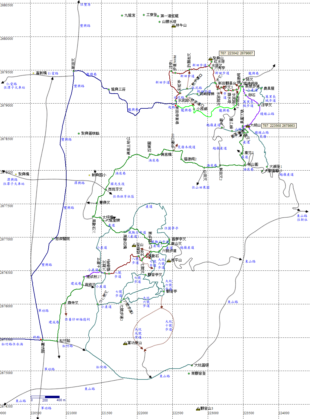 福德祠下方停車場,循龍興巷可回新田步道入口停車場,續行往大湖山的步道入口就在停車場角落,無明顯標示。H351m |