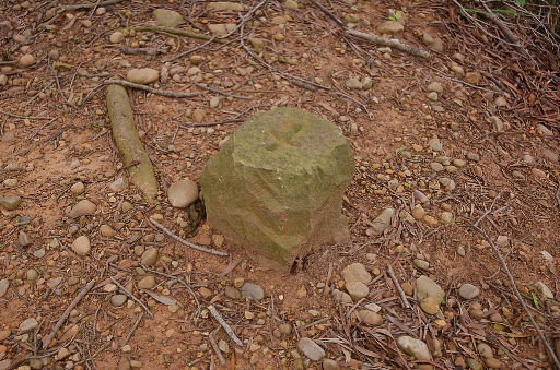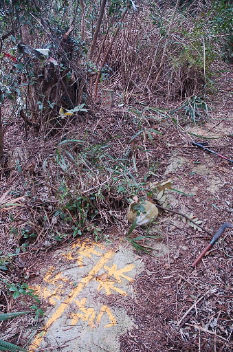 頭前溪水源保護區界12號水泥基石,位於月桃窩古道鞍部,有一條廢棄的水泥小徑從芎林方向上來,水泥地上有人標示著芎林、新埔地界。鞍部右下方有間廢棄小磚屋。H185m |