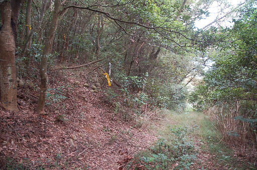 山頭旁叉路,左上山頭再循支稜可下往新埔水車頭,直行則是往三段崎古道、石頭坑山,附近路徑較亂,且登山指標都被拆除,容易走錯。本想先往左探一下路再回,結果路況太好,一路緩下,且三段崎古道、石頭坑山都已造訪過,我就沒有回頭了。最後一段才往左陡降下稜。H213m |