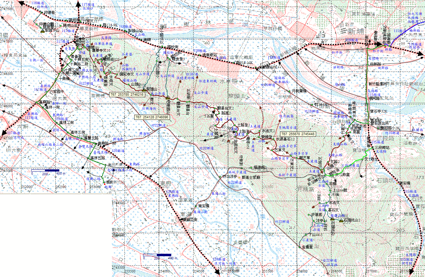 關埔路水車頭段47巷5弄,過水泥橋接上關埔路水車頭段(竹16鄉道),橋頭有登山指標,往文山步道東段、三段崎古道、石頭坑山。犁頭高幹47電線桿。休息整裝。H65m |