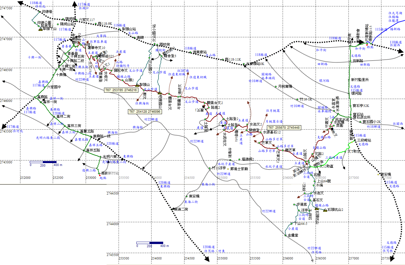 電桿組025(新竹-新埔線),026就在隔壁,續行山路循稜而行,路況不錯。稜線附近有兩條平行的路,隔得很近,隨便選。H96m |
