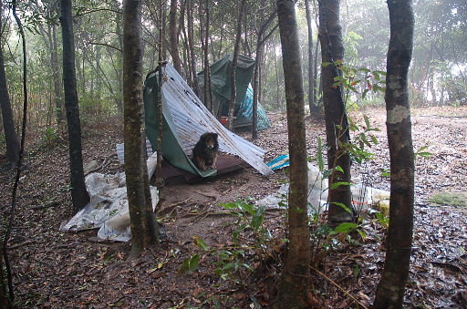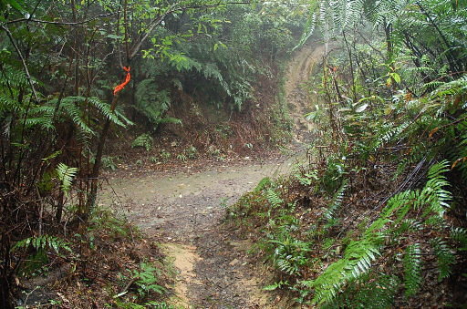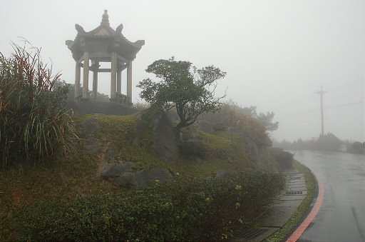 五指山站,叉路,左為北28鄉道往風櫃嘴,右為汐萬路往汐止。這個大叉路口咖啡座有好幾處,霧雨天沒有半個遊客。汐止社巴五指山線、八連線會到達此處,但班次稀少。取左往五指山。H620m |