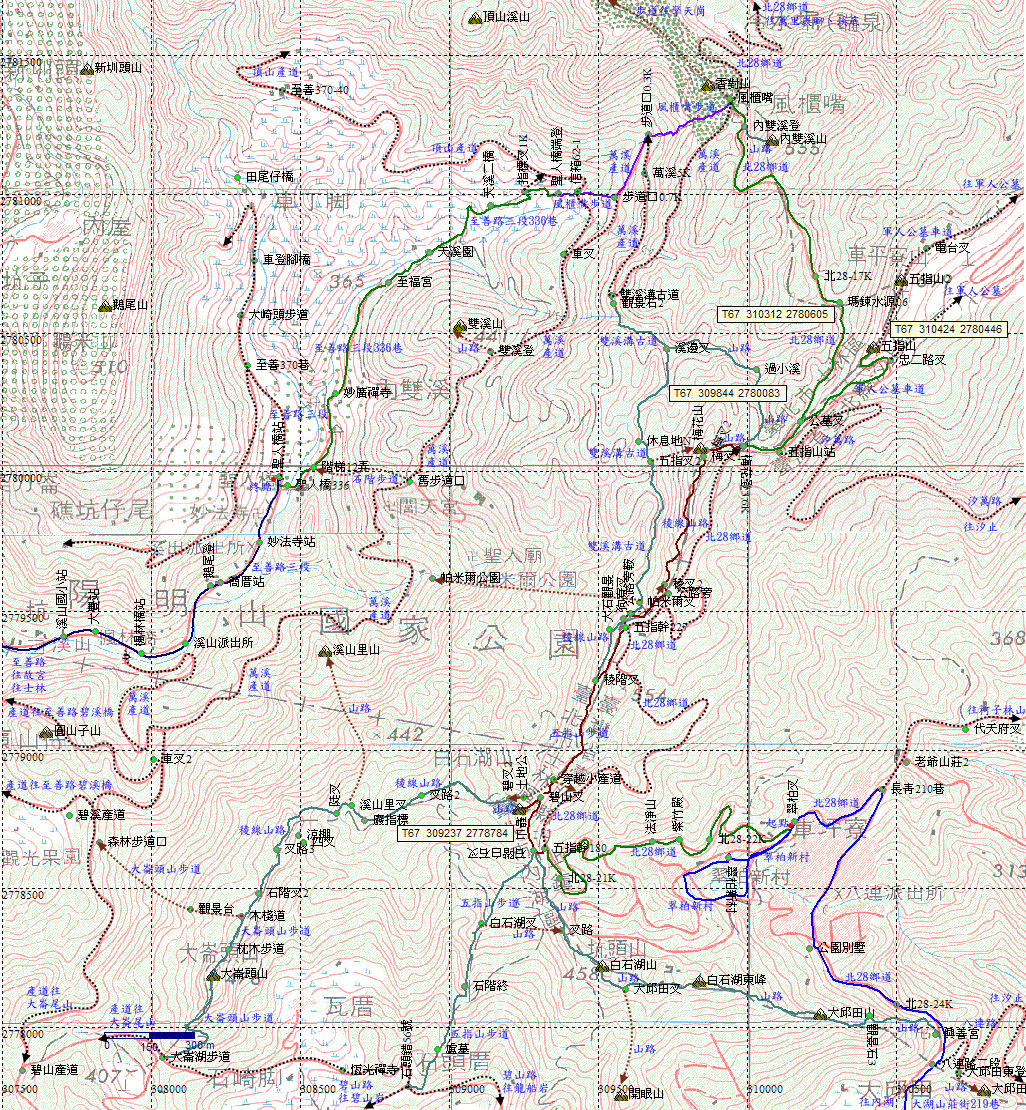 白石湖山叉路,接上五指山步道主線,左下步道往碧山路,右側步道往五指山,左側另有稜線山路往白石湖山。取右。H489m |