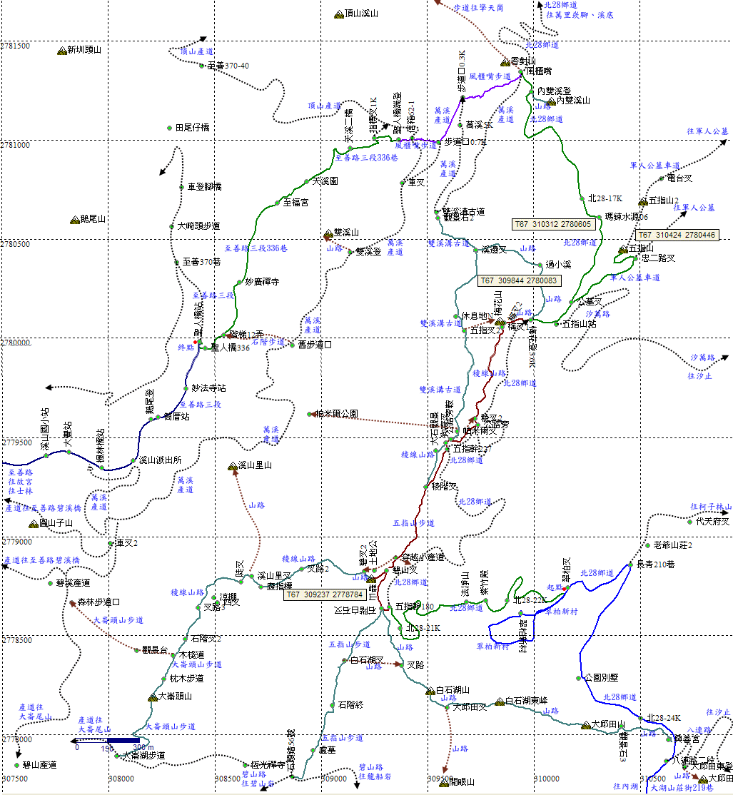 梅花山(插花山),640m,北市都市計劃處四等三角點NO.134。基石位於山頂略低處,樹林圍繞無展望。續行有山路可下接雙溪溝古道。H645m |