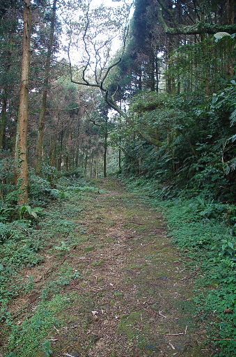 鬼子瀨尖步道口,接上大湖尾產道3K附近上來的小產道,停車空間不大,步道指標往鬼子瀨尖山1065公尺、35分鐘,並有坪林第五公墓告示牌,可是沿途並沒有見到任何墳墓。步道一開始是寬平的土路,不久才出現木階步道。H551m |