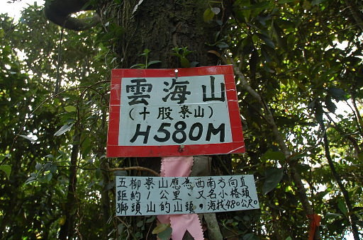 雲海山(十股寮山、五柳寮山),580m,無基石。山頂標示牌下方特別註明:『五柳寮山應為西南方向直距約1公里、又名小格頭獅頭山的山頭,海拔480公尺。』山頂隱約可見翡翠水庫,但視野大都被樹木擋掉。算算18號、17號之間的距離,16號也該出現了,可是17號可以埋在山頂卻被選擇埋在半山腰,這樣就增加了搜尋其它青潭水源保護區界基石的困難,我稍微在山頂附近找了一下就放棄。H578m |