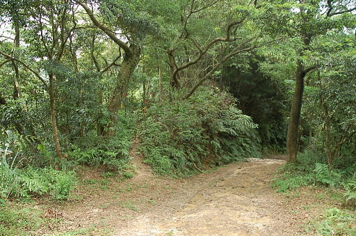 左右線會合,這個叉路口設有指標,直行往潭腰、山間茶棧、觀景點可下竹坑。續行轉為寬敞的土路,不久出樹林,視野開闊。H450m |