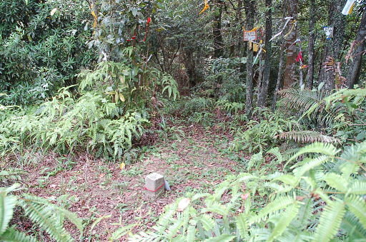 產道最高點,右側貼近石碇第十六公墓,產道旁有兩座墓園。首先由五郎寮幹6號電線桿處進入公墓,幾步就上到稜線公墓區,先取右循稜找找,沒發現。公墓內展望不錯,可眺望二格山、筆架山連峰。回頭改往左行。H487m |