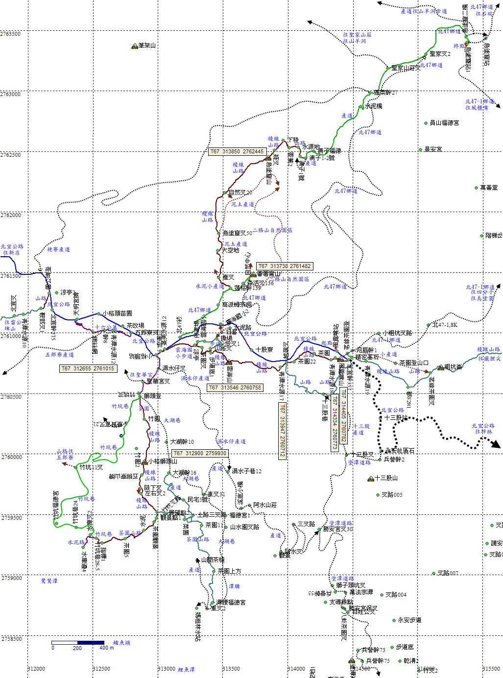 續行,循北宜公路往新店方向走,再伺機上稜找青潭水源基石。 |