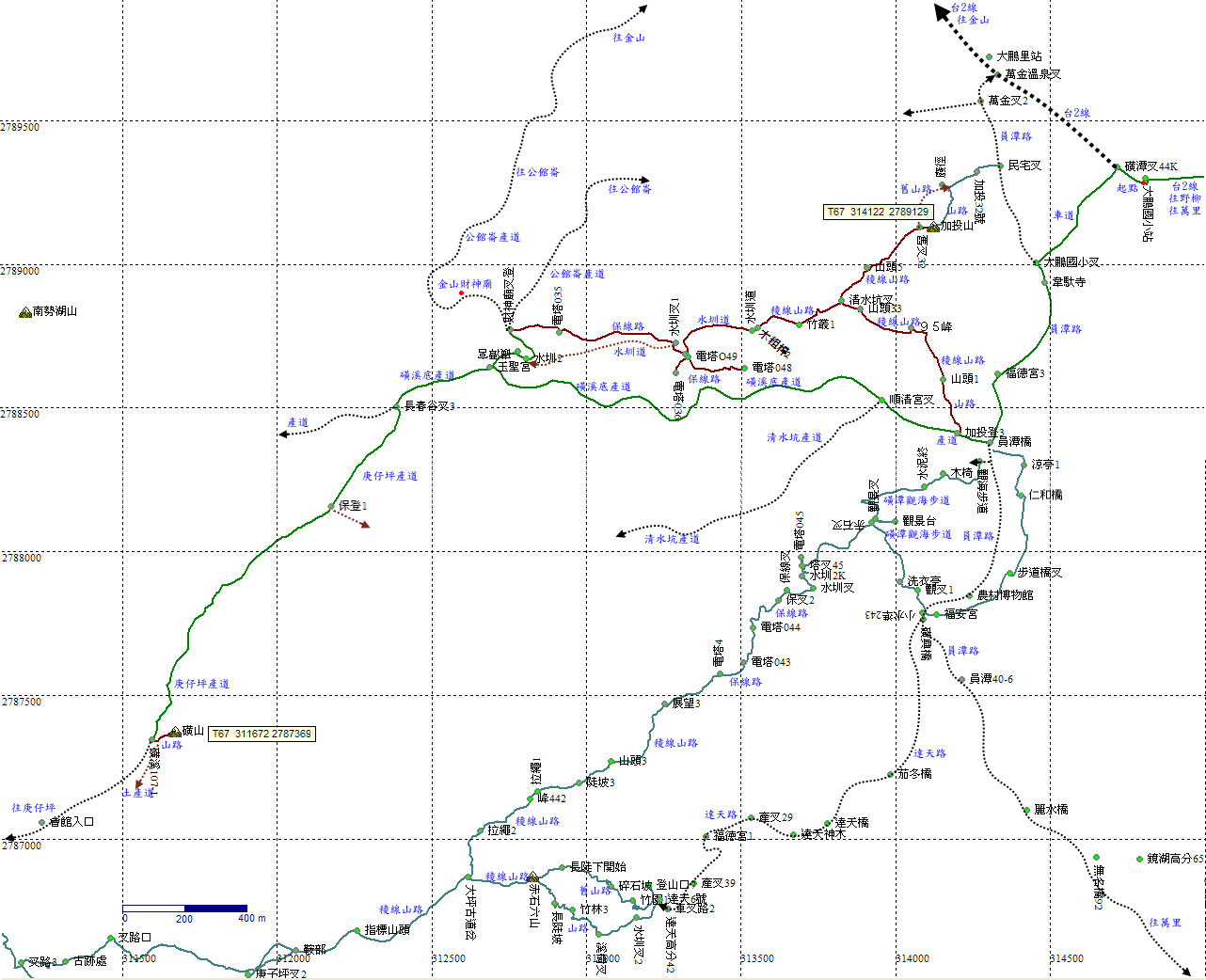電塔049(武崙-金山線,另一編號為國聖-金山線022)。續行仍有明顯保線路,續探,一路往下發展。H107m |