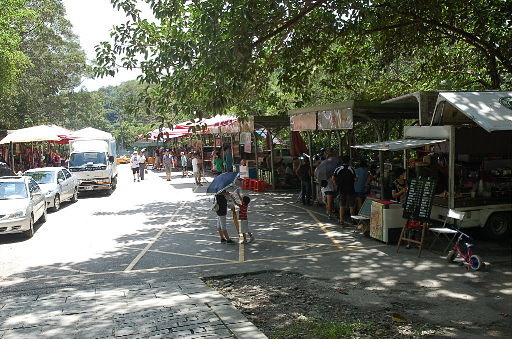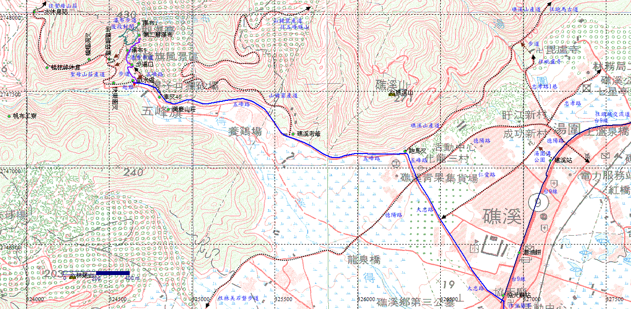 五峰旗瀑布步道入口,位於宜2鄉道(五峰路)終點,攤販雲集。循寬緩的步道往瀑布群。H102m |