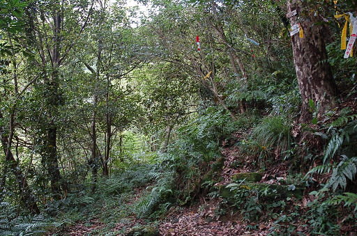 回到大埤古道叉路,取右往大埤古道下山。立刻遇東山叉路,左上稜線山路往東山約150分,直行往大埤、三叉坑分校約60分,直行。大埤古道路況還不錯,沿途有不少古老的石階,一路往下。最後抵達造林地,右下方有新闢的泥土產道。H419m |
