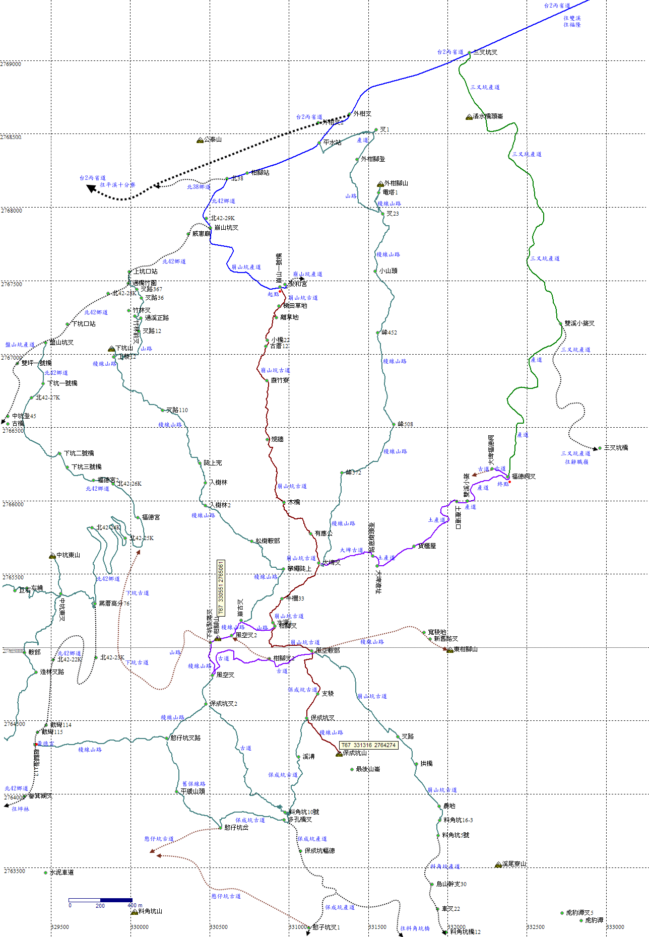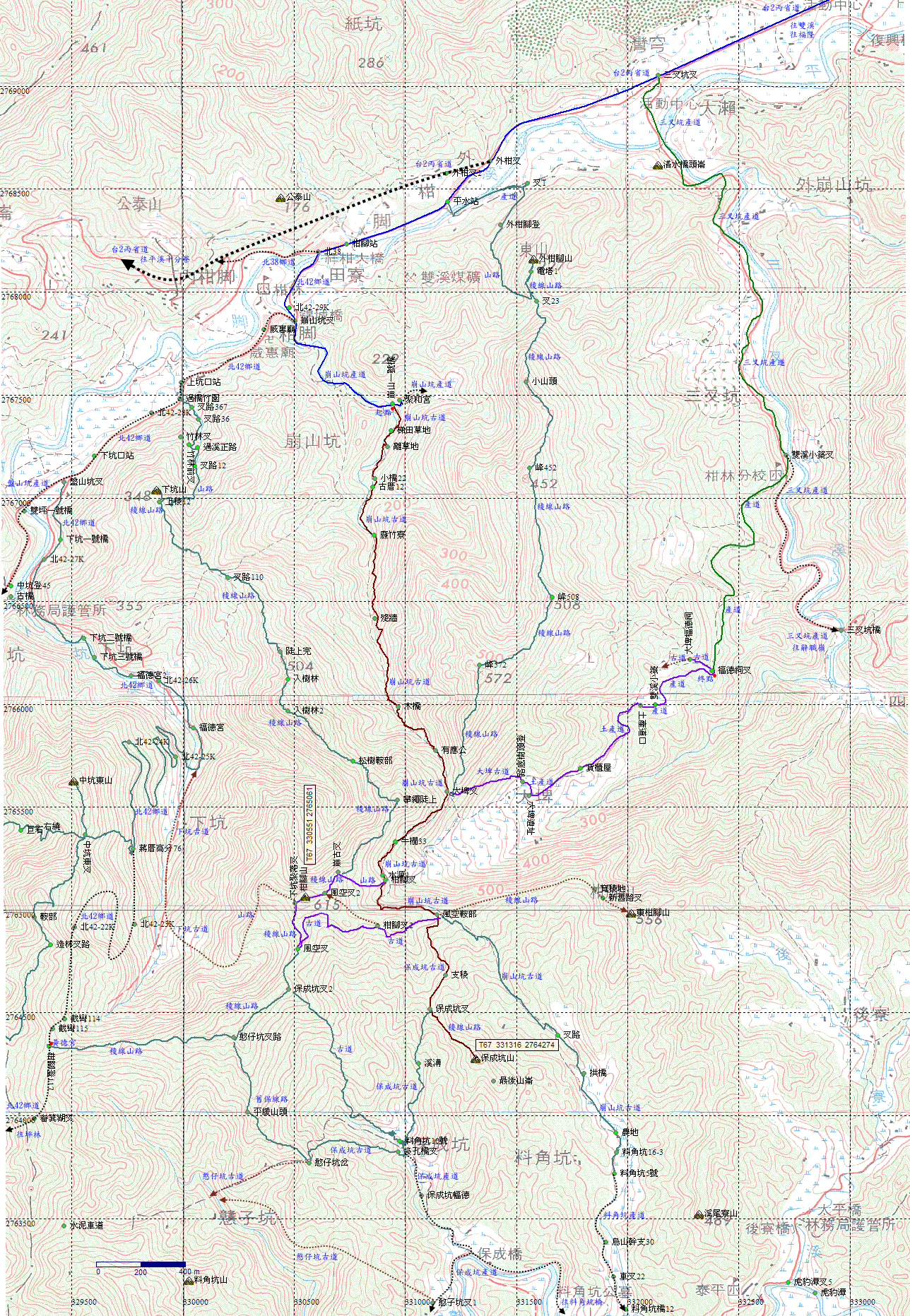 柑腳山叉路,右上山路往柑腳山約10分,直行往北42(坪雙公路)約40分,決定稍為繞遠路順探一下這條古道,直行,古道較少人走,但路跡還算明顯。H551m |