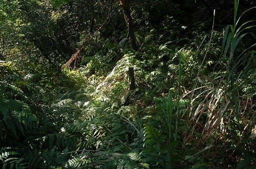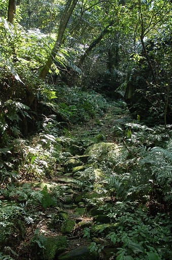 續行,古道跨越頗深的溪溝,原路徑崩壞,有兩條路可下,直下攀繩或高繞再往下。過溪溝後也是有兩條路,取左,上去之後竟一時找不回古道路徑,原來要往右下接回古道。之後的古道路徑仍好走。 |