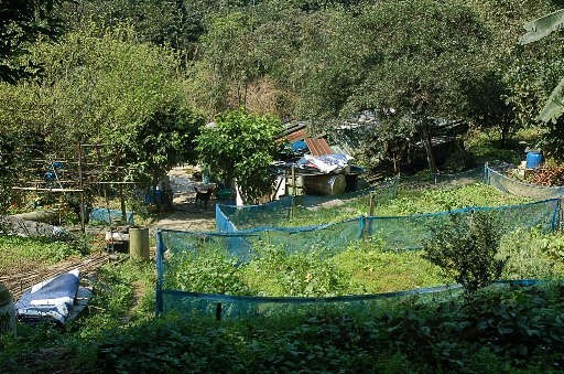 民宅,有養狗數隻,決定取左高繞民宅後方農地。繞過民宅之後,發現另一側出入口的鐵門封閉,無法通行,只好取左往上方水塔找路繞出去。H129m |