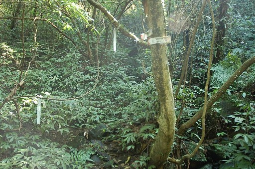 桂竹林山路入口,發現老舊的登山路條,路徑不明顯,取刀開路。稍後進入雜木林,仍無路條蹤跡,抓方向往前。H132m |