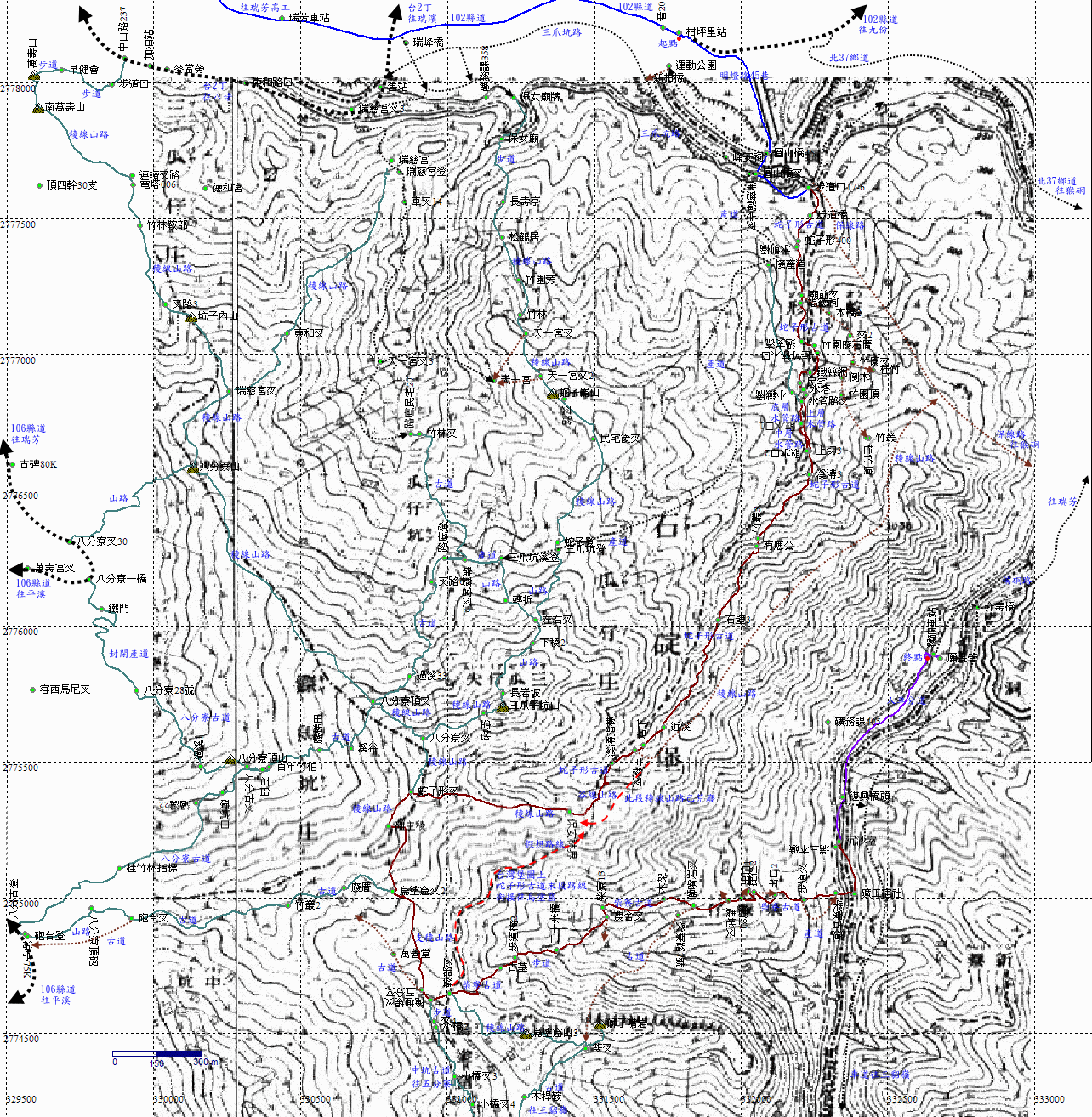 蛇子形古道叉路,接上三爪坑山主稜,左往烏塗窟山、106公路,右往三爪坑山,休息。續行,取左往烏塗窟,稜線山路路況不錯。H490m |