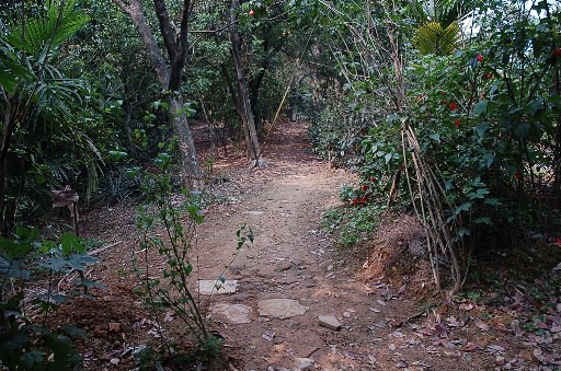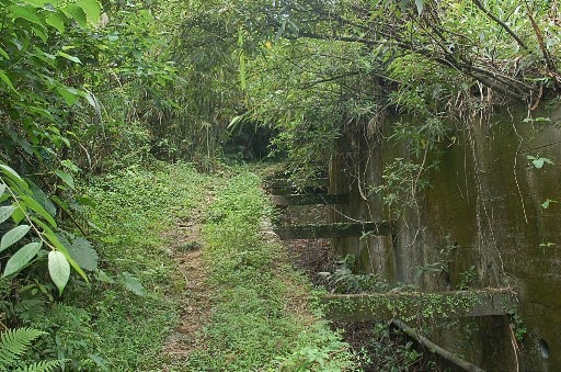 佛寺旁水溝,附近有廢棄屋舍,循水溝再轉民宅步道直下。中途有階梯可入佛寺。之後就在民宅區內抓方向往下,要從此處上山有點難找路。H65m |