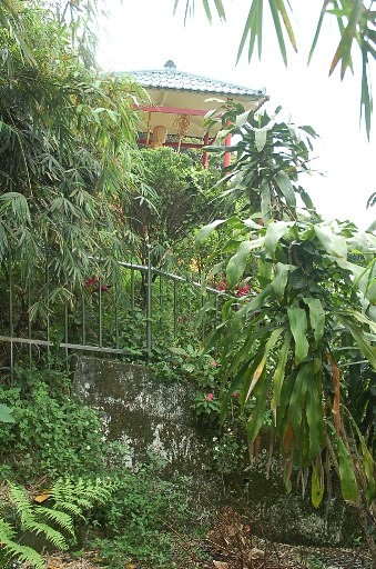 北稜第二座碉堡,半圓形,位於民宅後方稜線上,整座碉堡幾乎被大樹所盤據,情形跟獅球嶺東砲台類似。旁為民宅水塔。續行稜線小段發現稜線被切斷,下方大空地上建有涼亭,取左下切。H108m |