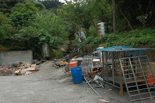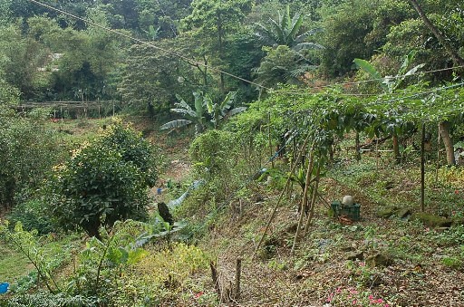 大型廢棄鐵皮屋舍,鑽過可接先前的大土路,仍續往下。之後都是菜園。菜園中可望見左下方為獅球嶺山谷中的水塘,叉路取左參觀一下水塘。H105m |