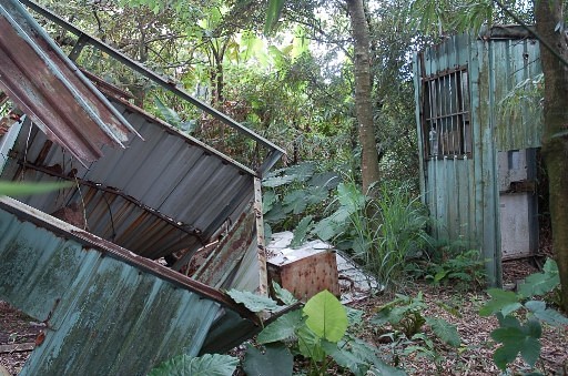 廢棄鐵皮屋舍,附近有疑似壕溝,續行有纜繩助攀的小徑往下,忘了多搜尋一下齒型高地四周,跟著往下。H130m |