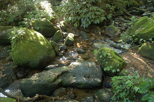 續行,進入乾坑古道,古道循溪上行,偶有古老的石階。中途可見幾根木電桿。 |