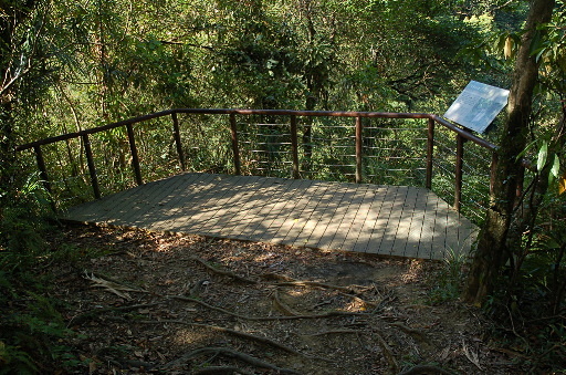合谷瀑布觀瀑台,位於步道1.2K,合谷瀑布是三貂嶺瀑布群中水量最大,也最為壯觀的瀑布,瀑布分上下兩層,上層高約25公尺,下層高約15公尺。可惜只能遠觀,夏日少雨,瀑布規模嚴重縮水。觀瀑台隔壁有間姑媽廟,原本石砌古老小廟居然被改建得煥然一新、古意全失。H172m |