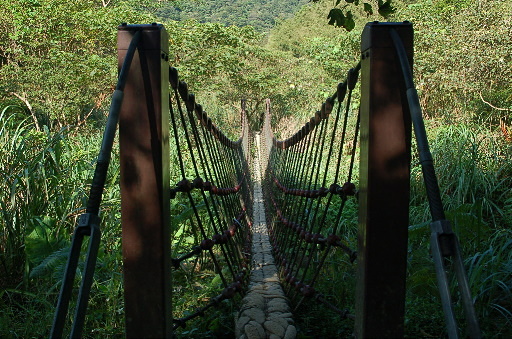 回到柴寮叉路,取右攀繩而下,山路崎嶇難行。H370m |