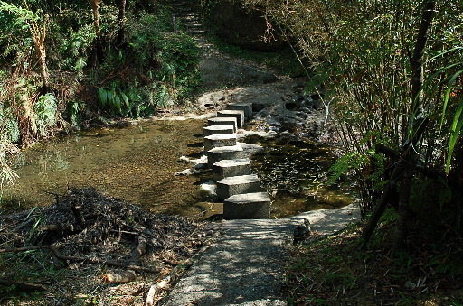 觀瀑台叉路,左往猴硐車站3200公尺,右往觀瀑台3000公尺,此處的觀瀑台應該指的是合谷瀑布觀瀑台,右路為山路且少人走。取左。稍後步道開始循著烏塗窟溪往上游,多次過溪皆設有踏石或木橋。H313m |