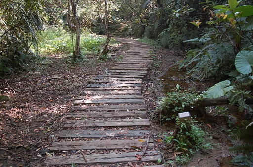 步道越嶺點,左側循稜山路有登山路條,不知通往何處?右側有個已荒廢的休息平台。續前行。H320m |
