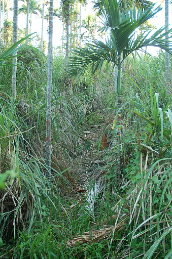 廢棄農舍過後廢產道叉路,取右進入廢棄產道。沿途雜草叢生,頗多芒草,幸好此山還不算太冷門,目前路況不錯。末段沿著廢棄檳榔園芒草小徑直上。上稜後往左十幾公尺即登頂。H416m |