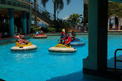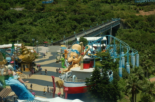 晴空纜車,因帶著嬰兒車,搭電梯上樓,與人潮分流,很快即搭上纜車。纜車上展望極佳,可俯瞰園區設施,到達終點的水晶城堡之後,慢慢往下玩。午餐後發現人潮變得好少,原來都被12:50開演的海豚秀吸引過去了。 |