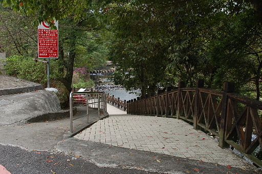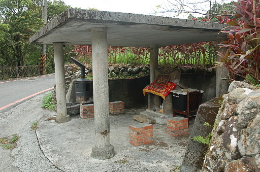 虎豹潭入口,路旁有座古老的石砌小土地公廟,福壽宮,對聯是經典的『白髮知公老‧黃金賜福人』。出發,循步道下往北勢溪上游的虎豹潭。溪邊設有公廁,續行的步道沿溪右岸(上行時的左側)往上游。H363m |
