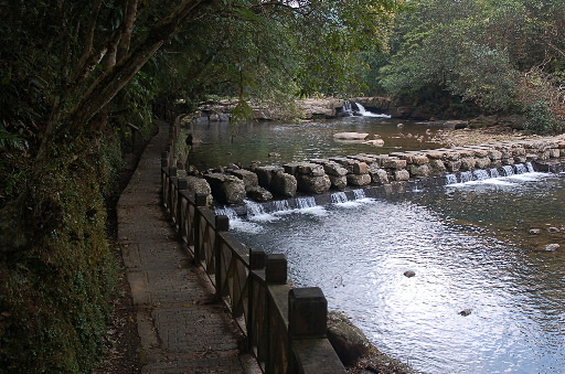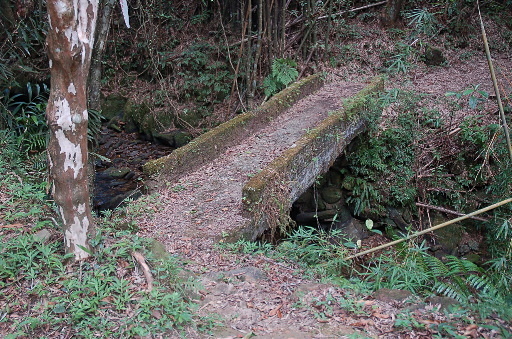 水泥橋,叉路,左行過橋往紅壇、破子寮、大平山,為紅壇古道,右行仍走溪岸往三方向山水路經合流瀑布,為竿蓁坑古道(或芊蓁坑古道),取右。之後的路徑有些不像是古道,但路況還算好走,大致上循北勢溪左岸(上行時的右側)往上游。H443m |