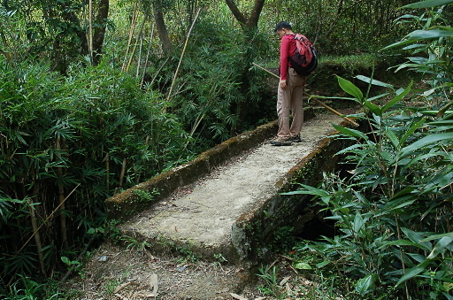 蛇木橋,抵達北勢溪畔,此處溪中有大岩床,形成天然滑水道,又是極佳的戲水地。取左過蛇木橋循溪往上游,最後抵達廢棄水圳道,本想續行大平山腰古道,卻走錯路。H406m |